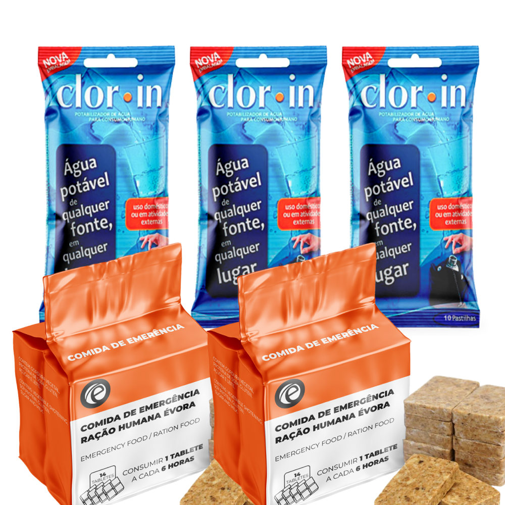 Alimentação e água segura em um único combo. Essencial, compacto e pronto para situações de emergência.