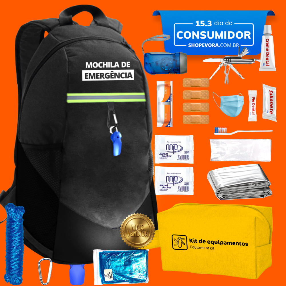 Elaborado conforme normas Internacionais de Defesa Civil, com alta qualidade, leve e resistente, o Kit de Emergência Évora Essencial reúne itens essenciais para uma situação de Urgência e Emergência. Ele é multifuncional e ideal para ter sempre à mão produtos imprescindíveis para enfrentar situações imprevistas, tais como: incêndios, enchentes, desastres naturais, vendavais, pandemias, entre outros. A Mochila de Emergência Évora Kit Promo Essencial é prático, sua Mochila de Emergência conta com design anatômico feita em material impermeável e com faixa refletiva, que ajuda a localização no escuro e em casos de soterramento e desmoronamento.